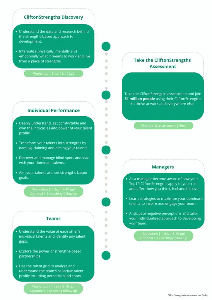 The CliftonStrengths For Managers Program is a 3.5 day course and costs 5500€ (excl. VAT). This includes the cost of the CliftonStrengths34 assessment.